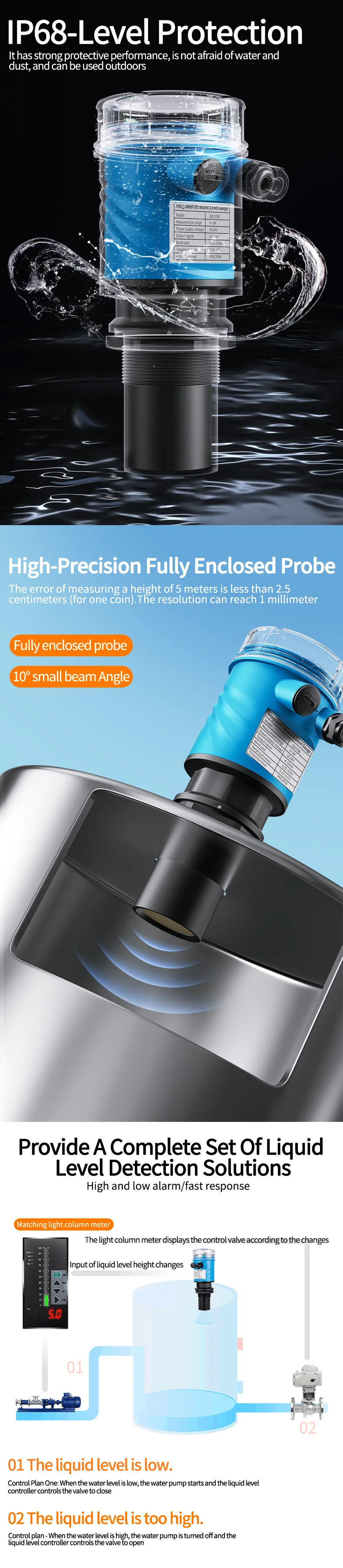 Ultrasonic Water Level Sensor 3m 5m 10m 15m 20m Meter 4-20mA Relays Output Ultrasonic Water Tank Level Meter Wireless Distance
