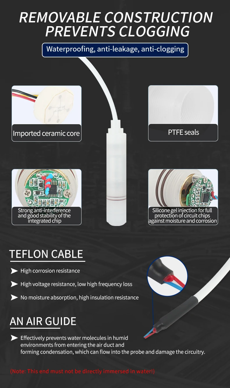 Anti-corrosive Liquid Level Sensor PTFE 3m 5m 4-20mA 0-10V Transmitter RS485 Submersible Water Level Transmitter pp probe