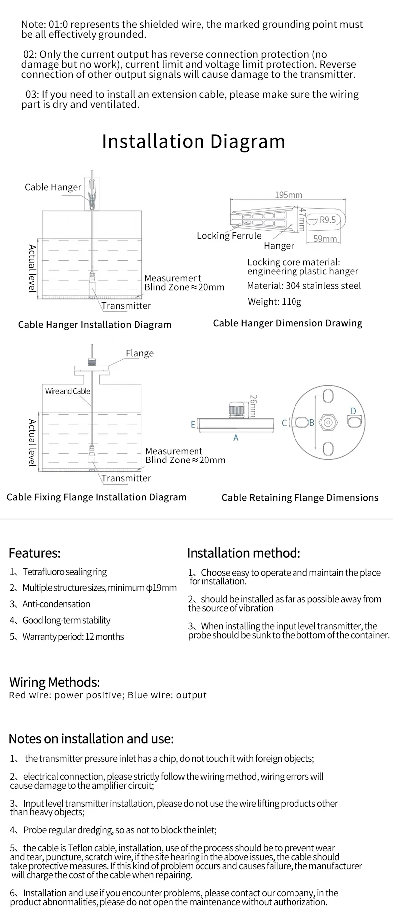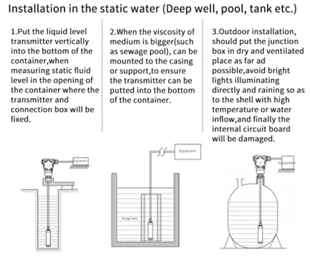 QDY60C submersible liquid level sensor,the corrosion resistant silicon sensor makes it suitablefor most Corrosive liquids, such as strong acid nad strongalkali.This level sensor uses high performance pressuresensor as sensing element, which could measure liquid staticpressure that is positive proportional to level depth precisely,and transform pressure signal into standard current or voltagesignal output by amplifier circuit to measure accurate level depth.It has the advantages of Strong anti-interference ability,waterproof,dust-proof,anti-corrosion,anti-acid alkali,anti-blockage.