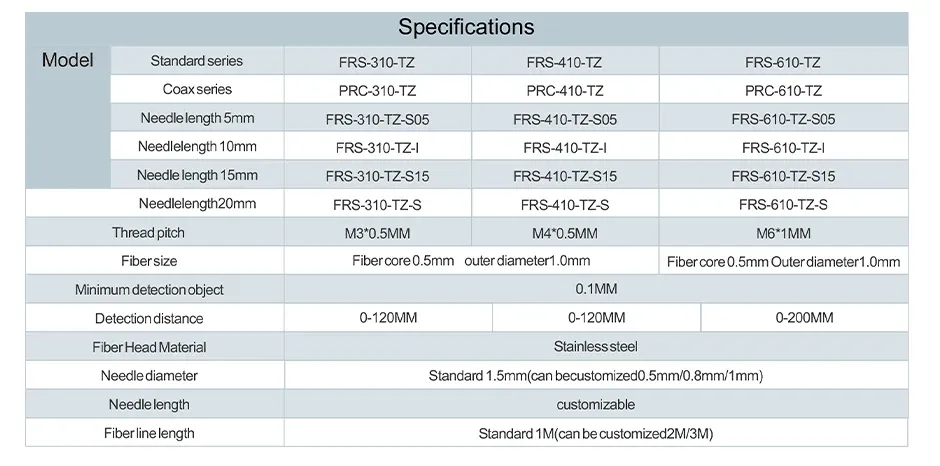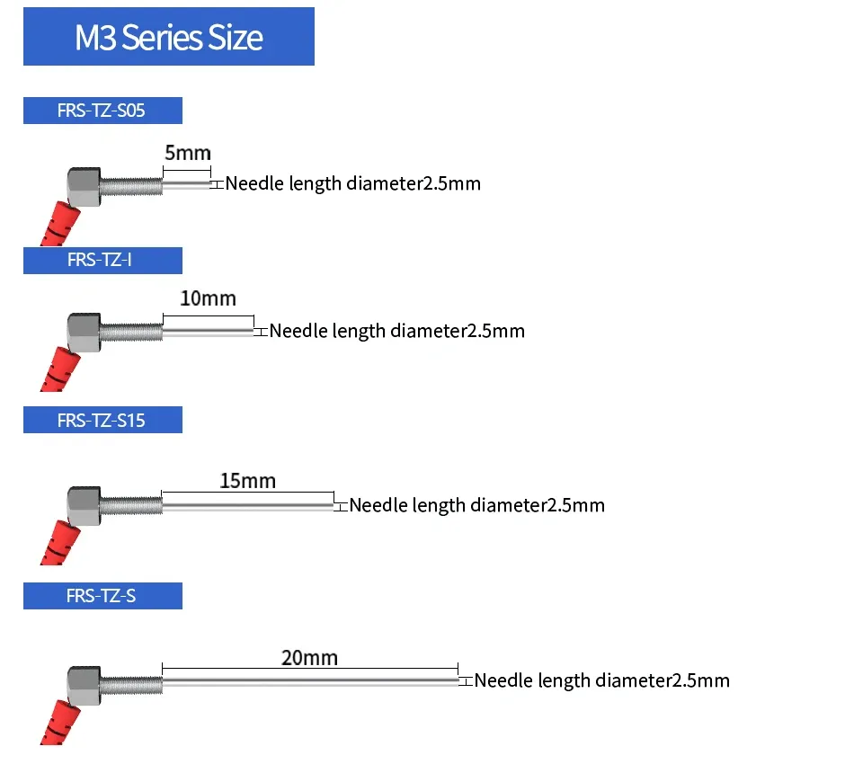 The Elbow Diffuse Reflection (TZ) head (as seen in our product line) lets you mount the sensor at 90° angles—perfect for lines with limited vertical/horizontal space. Plus, we offer multiple needle lengths (5mm/10mm/15mm/20mm) and thread sizes (M3/M4/M6) to fit your exact setup.
